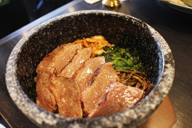 まずは、カルビ丼。テーブルに届いた状態で炙って仕上げてくれます。500円代のランチでやってくれるサービスちゃうぞこれ。