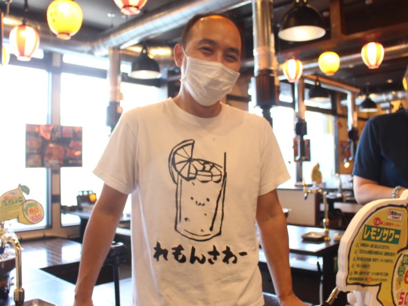 レモンサワーが好きすぎて、シャツも自前のレモンサワーTシャツ。めっちゃ欲しい。