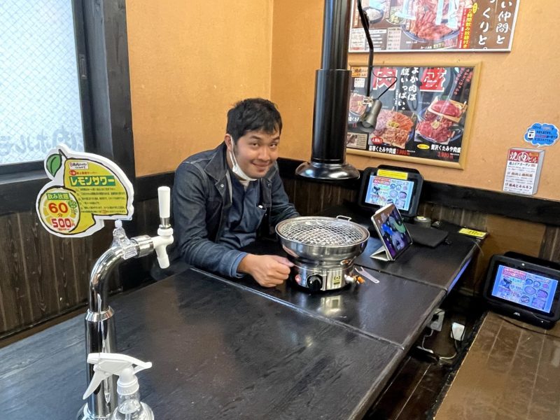 ということで、真っ直ぐに座席へ。注文はタッチパネルで非接触。各席のサーバーでレモンサワーも非接触。全席にダクトが付いていて、店内の空気が1時間で21.5回入れ替わるという驚異の換気力。このご時世、嬉しいことばかり。