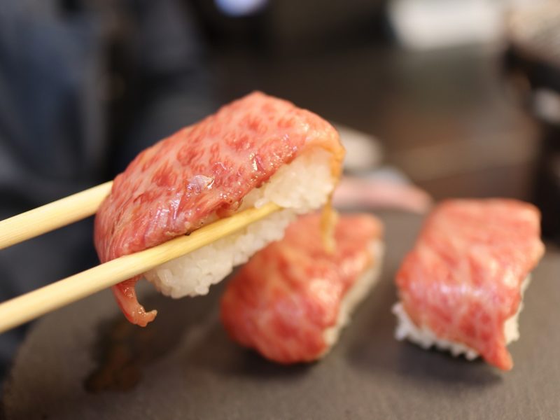 まずは、焼けるまで肉寿司を食べましょう。控えめに言って最高です。ワサビとの相性がたまらないので、目一杯つけちゃいましょう。食べたら思わず笑ってしまいます。