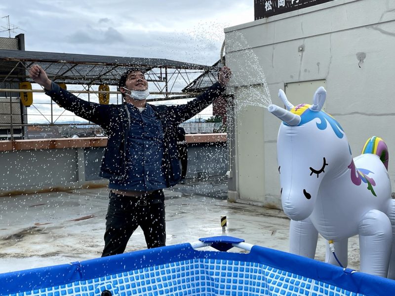 ユニコーンの角から水が噴射されてプールに溜まっています。