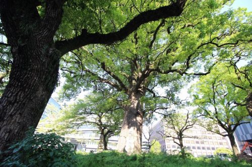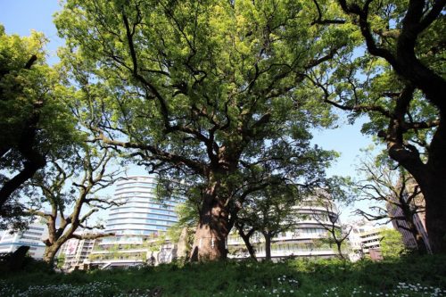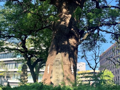 中央のクスノキが熊本市指定の天然記念物。幹の周囲は約7メートル、高さは30メートルほどあります。