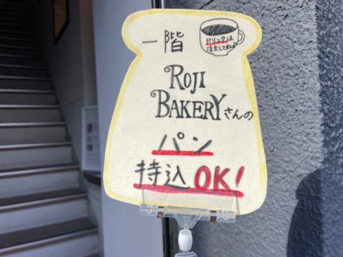入口で、「ROJI BAKERYさんのパン持込OK!」という嬉しい看板を見つけ、パンを1個購入して2階に上がってみることに…。