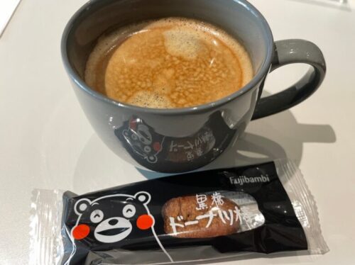 こちらも熊本名物・黒糖ドーナツ棒が1本無料という嬉しいサービスもあり、コーヒーとドーナツ棒を持って席へと向かいます。