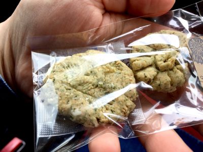 化石のクッキー(青のり)です。化石だなんて「恐竜の郷みふね」らしいクッキーですね。その他、アイスサンドクッキーやシフォンケーキなども販売されてデザートまで楽しめるお店です。