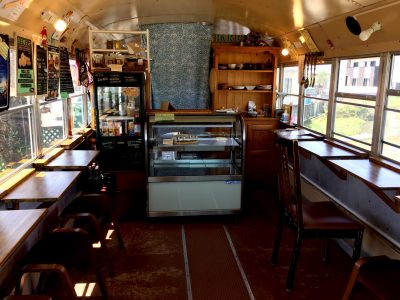 バスの中は外の景色を楽しみながら食事が楽しめる温かい雰囲気。内装から電気工事など、すべて自らリフォームされたお店です。