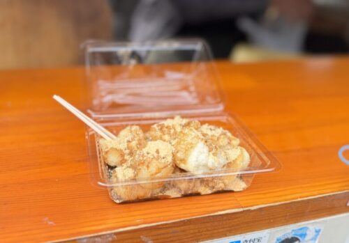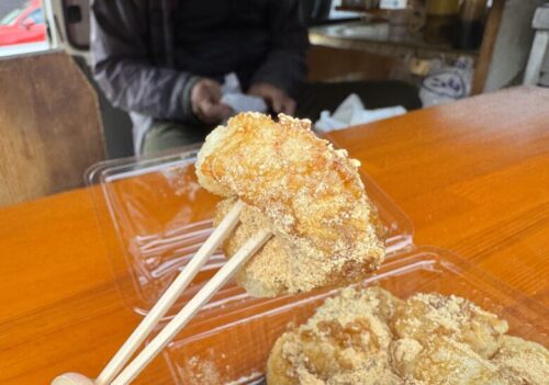 揚げた細切れ餅に、きな粉と黒蜜がかかってる、甘い物好き垂涎の逸品!
