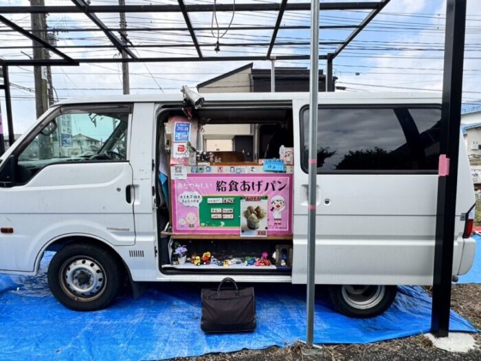 「給食あげパン」と書いてあるピンク幕を垂らした車を発見できます。