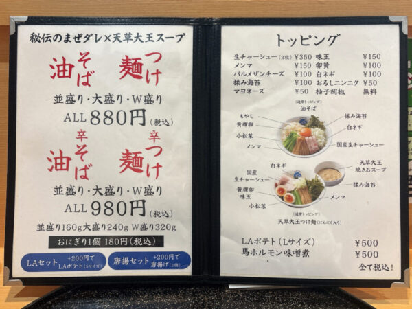 メニューはこちら。店名にもあるように、油そばとつけ麺が食べられます。