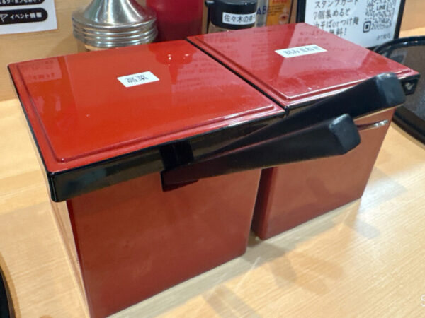 自分好みに味付けに仕上げられるのも油そばの楽しみの一つ。テーブルには様々な味変アイテムがあります。
