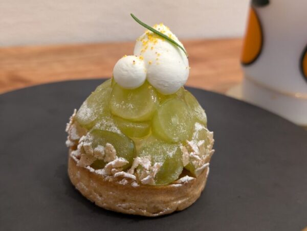 タルト生地はサクサク、カスタードは甘さ控えめで、シャインマスカットの香りや味を邪魔しないベストマッチ。