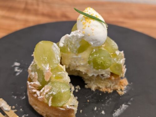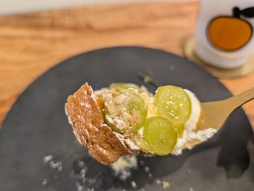 生クリームの乗ったシャインマスカットの下にはカスタード、そしてタルト生地。(すみません、切り口が美しくない…)