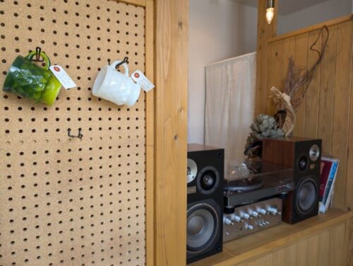 手前にはボードにかけられたマグカップ。