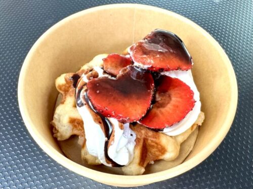 こちらはいちごのワッフル。(300円)なんとこのワッフルシーリーズは2個買うと500円になりますので、小学生のおやつにもぴったり。250円で食べる事が出来ますよ。