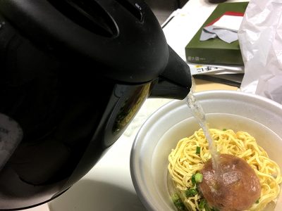 熱湯を注いて5分待ちます。見た目は“ゴボウのかき揚げ”にお湯を掛けている感じですが、ユニークな麺だけに期待も高まります!