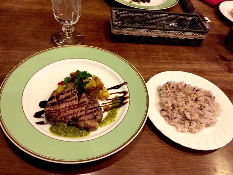 阿蘇自然豚のソテーです。ライスが雑穀米でとても美味しそうです。