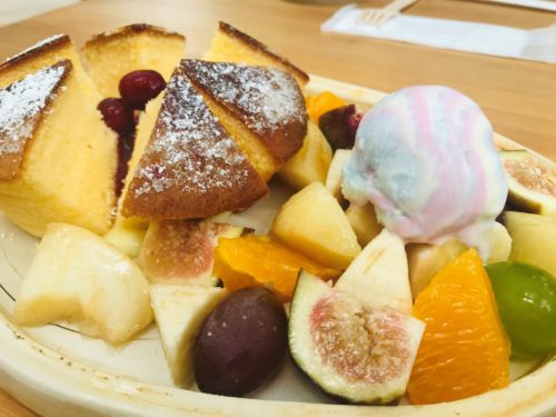 さっそく、パンケーキドリンクセット(税込1000円~)を注文。果物山盛りのパンケーキ。アイスまで乗っています。