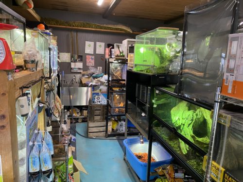 沢山のゲージや水槽が並んで、ゲージにはそれぞれライトが付いています。