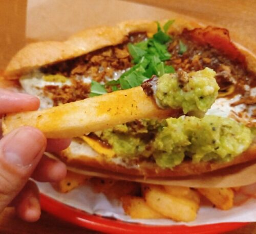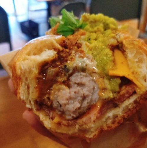 というわけで、チリ(豆と肉の煮込みソース)、チーズにベーコン、ワカモレ(アボカド)が乗った「モンスタードッグ」をオーダー。