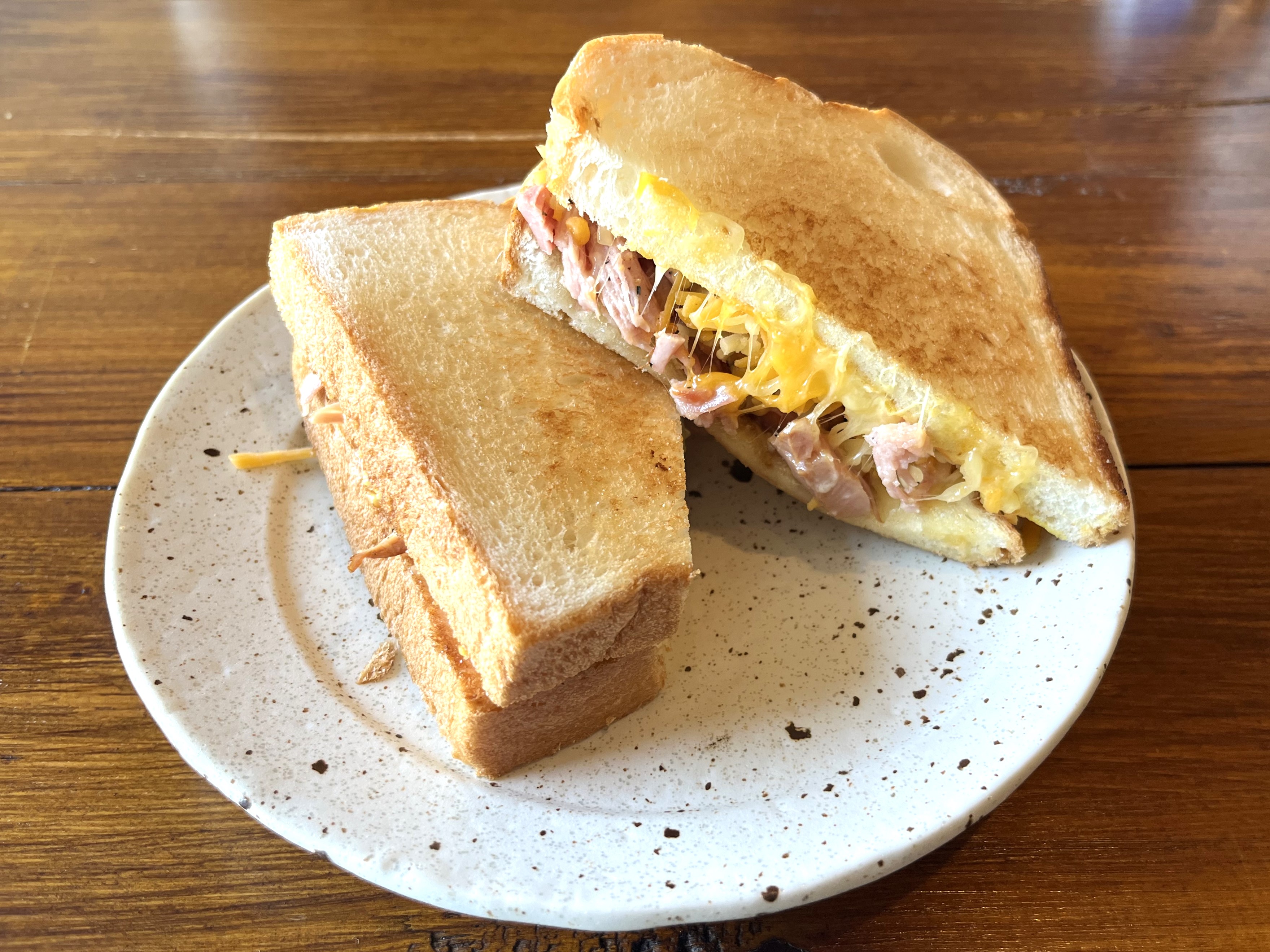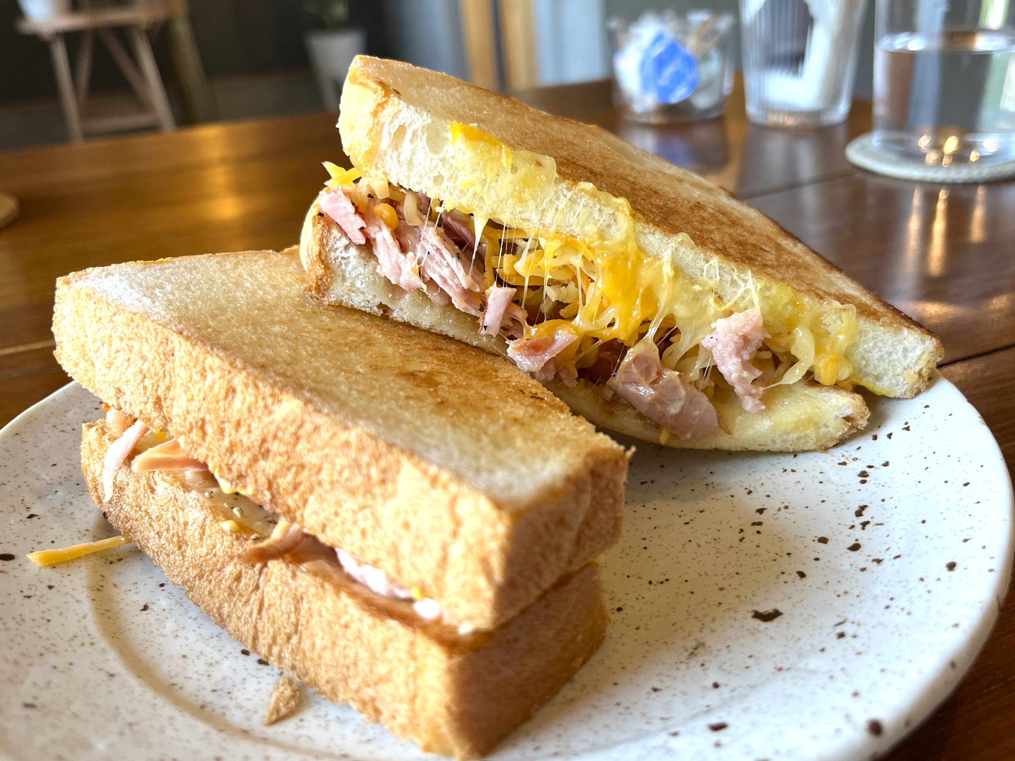 美味しそうな音と匂いを楽しんでいるとやってきました。私はと自家製ベーコンとチーズのグリルドチーズサンドにしました。