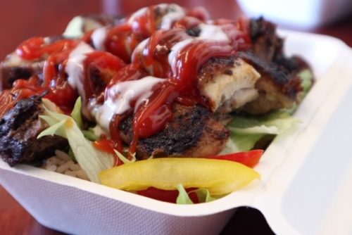 ハーブとスパイスで漬け込んだ鶏肉を使ったチキンオーバーライス。ライスはココナッツミルクの豆ごはんで、これは美味しい!!!