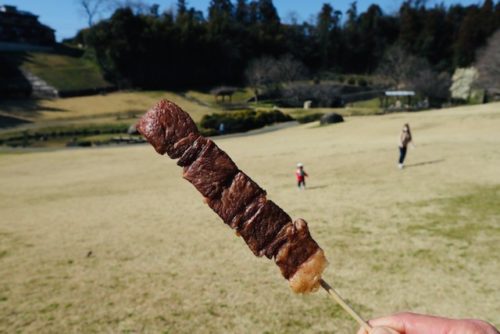 公園の素敵な風景をバックにステーキ肉を撮ってこい