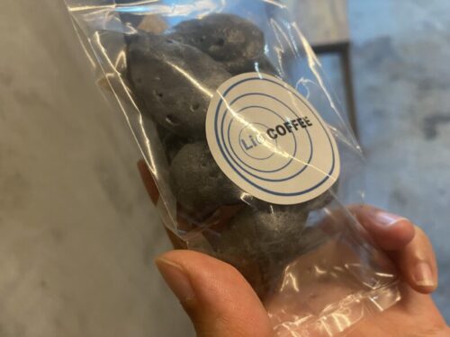 黒いハートの正体は竹炭で色を付けたメレンゲ菓子。テイクアウトの珈琲にも合うしっかりした甘さです。口の中でしゅわっと溶けて楽しい!