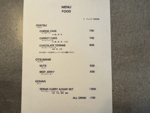 こちらはフードメニュー。ケーキ類、おつまみ、カレーがあります。