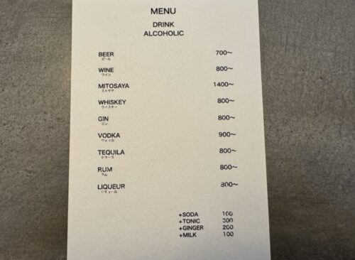 ソーダ(+100円)、トニック(+300円)、ジンジャー(+200円)、ミルク(+100円)お好みで割ってくださいね。