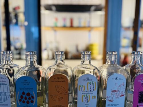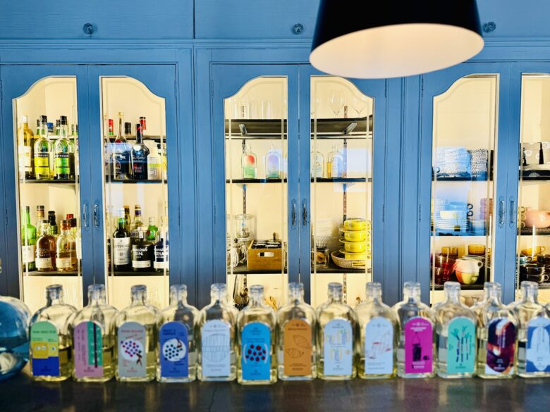 可愛い小瓶が並んだカウンターに座ります。こちらのおしゃれな瓶は「MITOSAYA」という蒸留酒だそうです。外からもちらっと見えておりましたが、とてもかわいい!