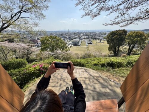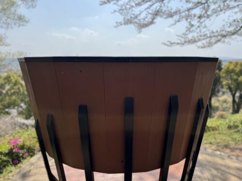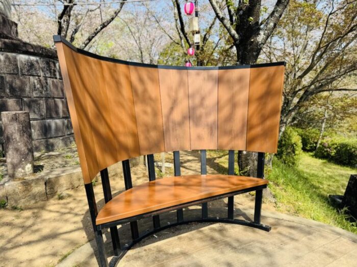 こちらの羽のベンチは、菊池一族の家紋の鷹の羽をモチーフにしているそうです。2枚の寄り添った羽が夫婦のように見え、目の前の開けた世界に2人で飛び立っていくようなイメージとの事。