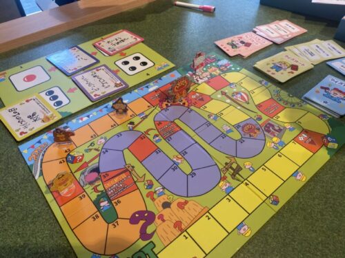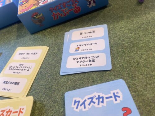 基本要素はすごろくです。ですが、出目はダイスを振るのではなくクイズに答えた人から先着順で「1~6」までの好きな目を決めてその場所に解答したカードを置きます。
