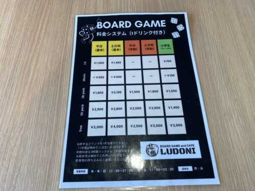 | 料金体系 | ボードゲーム利用料金(税込) 小学生 未就学児 |