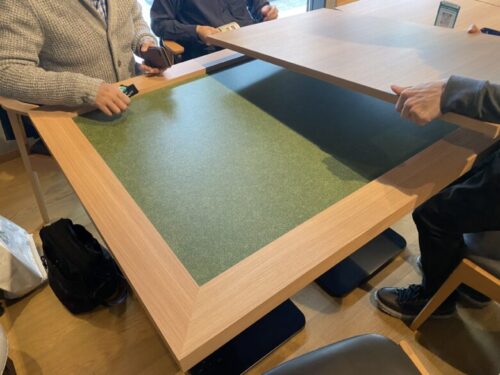 特注の机は、天板を外すとボードゲーム使用にチェンジ。