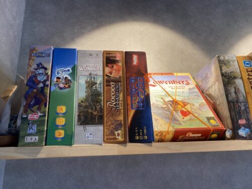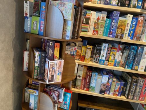 平置きされているのは、陣取りゲームの最高峰として名高いカタンの製作者による『レーベンヘルツ(旧版)』。副店長(店長はこあちゃん)が屈指のボードゲーム好きということもありあまり他で遊ぶことのできないゲームで遊べるもの楽しいですね。