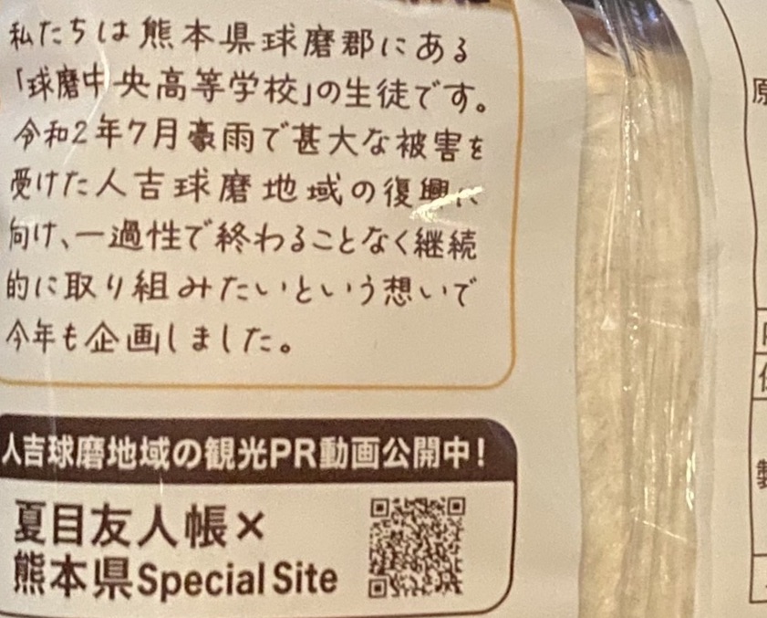 パッケージの裏にはその想いと、人吉球磨地域の観光PR動画として、「夏目友人帳x熊本県Special Site」のQRコードがついています。アニメ夏目友人帳の舞台のモデルとなっている人吉球磨の景観を優しい物語と主に楽しむことができますよ。