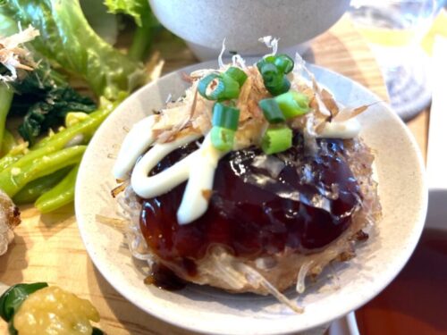 珍しいお好み焼き風のハンバーグは、春雨もたっぷり入っていてヘルシーで、斬新かつ美味しいハンバーグ!