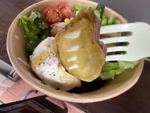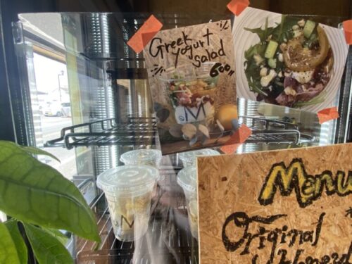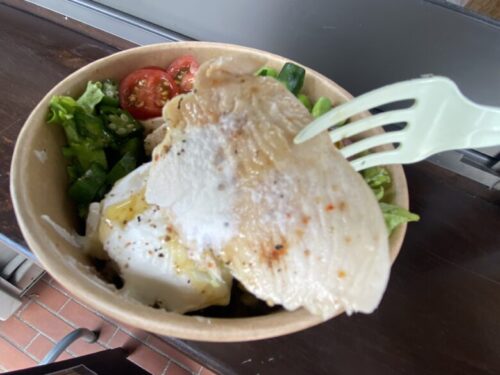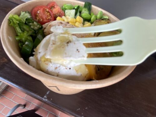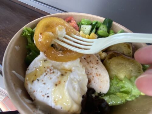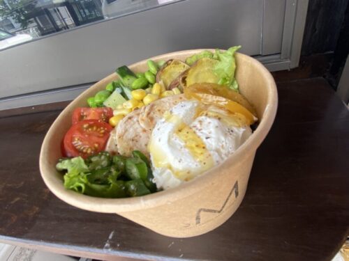 グリークヨーグルト(水切りしたヨーグルト)、2号の自家製サラダチキン、大津のさつまいも、たっぷりの野菜が入ったサラダ。ソースは蜂蜜とハニーレモンの2種類から選べます。