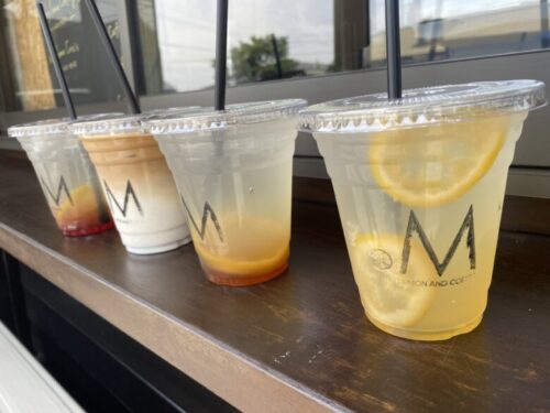 見てください、この色とりどりのレモンソーダ!コーヒー以外の3種のレモン系には全てに不知火産レモンを使用した自家製の蜂蜜漬けレモンが入っています。