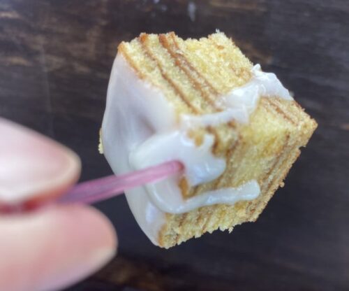 クレープ生地を重ねた一口大のミルクレープに自家製のハニーレモンを使ったシロップが掛けられています。甘酸っぱいハニーレモンソースと甘くてもちっとしたクレープ生地の組み合わせはベストマッチ。