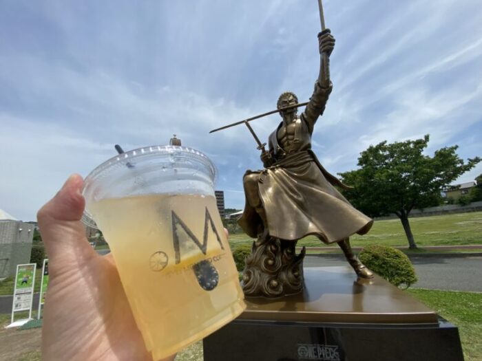 ワンピースのゾロ像が.Mから徒歩5分ほどの場所にあったのでレモンソーダと写真を撮ってきました。
