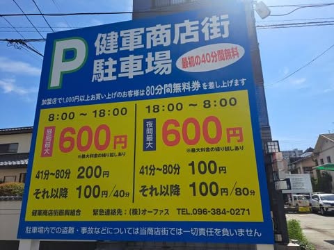 | 駐車場 | 健軍商店街駐車場を利用 (40分無料、1000円以上購入で80分無料) |