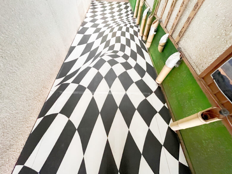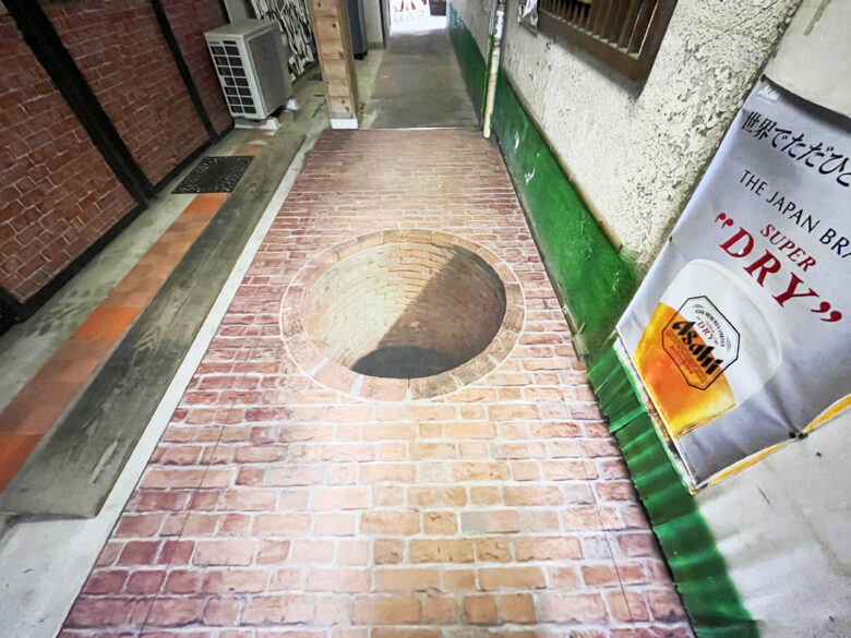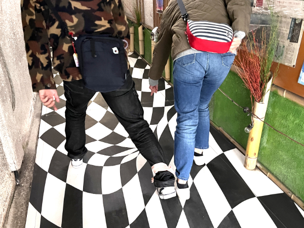 そんな数あるスポットから選んだイベントの会場は「こめや通り」。スナックなどの飲食店が集まる通りなんですが、なぜかトリックアート仕様。