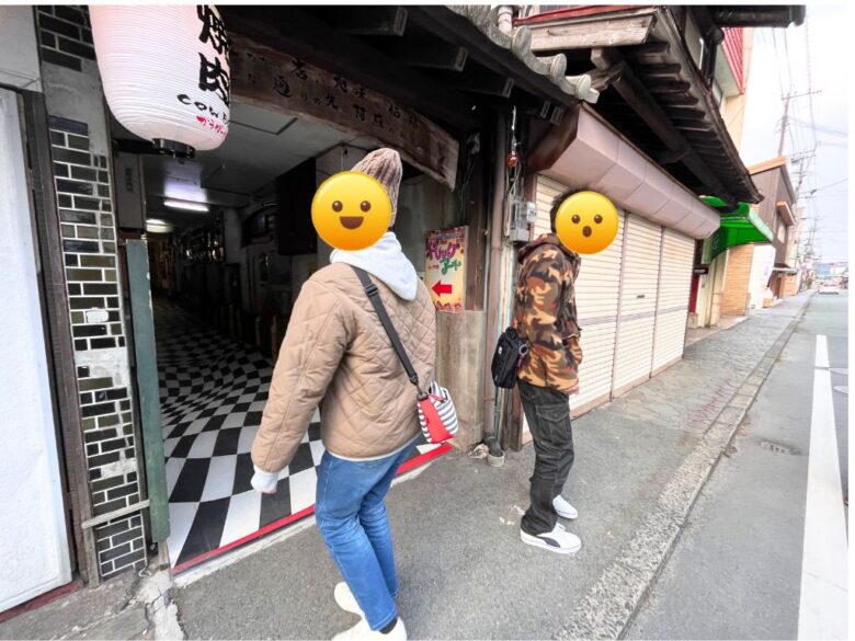まずは最初のミッション。こめや通りに入る前にその場でぐるぐる回転し、ふらふらになった状態で進みます!
