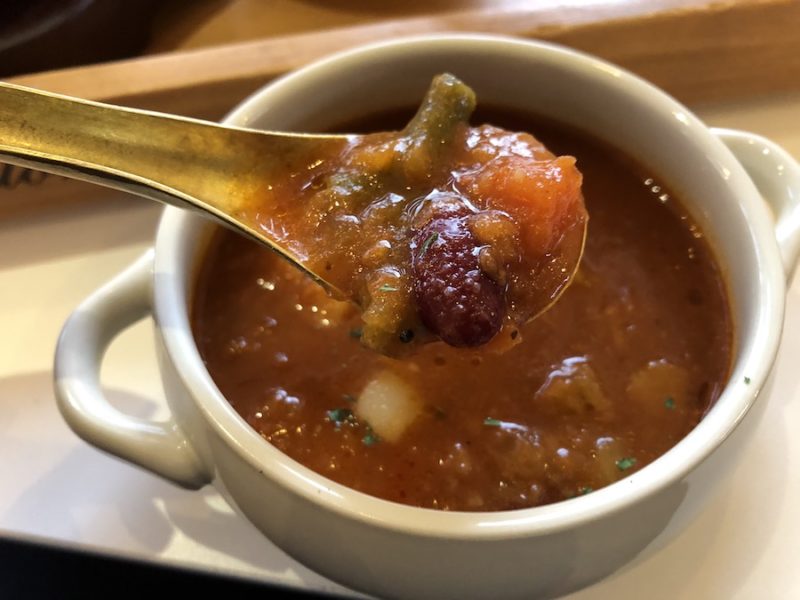 セットメニューも頼むと、日替わりスープなどもついてきます。この日は、野菜やお豆たっぷりミネストローネ。料理はちょっとずつの量を、だけどバランス良く食べたい! なんてわがままにも対応していました。
