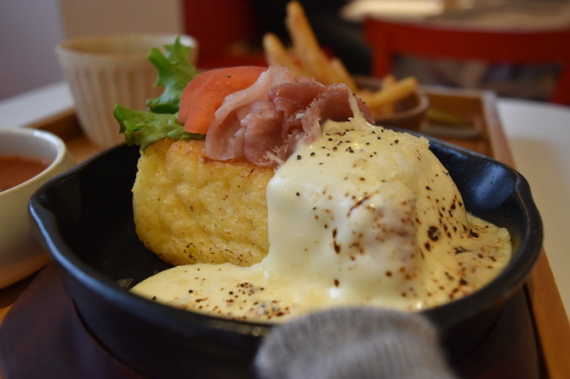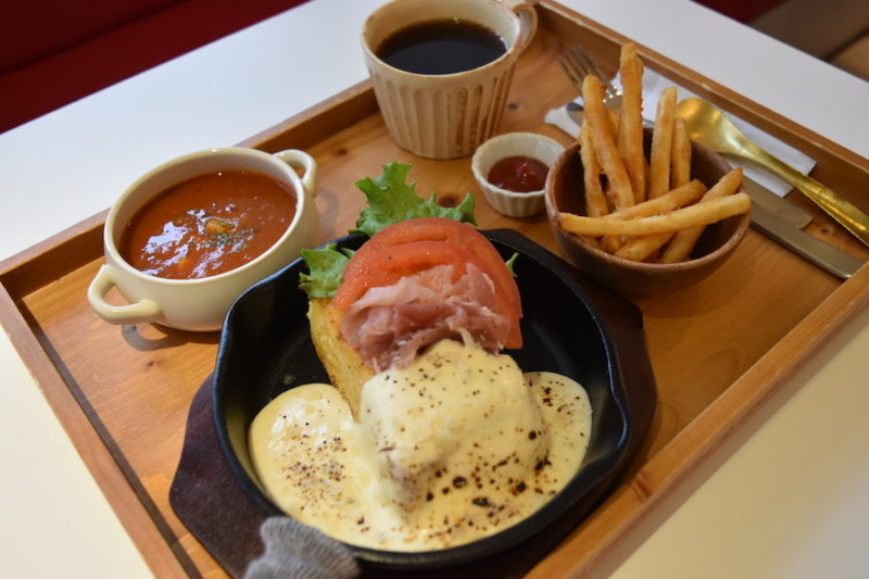 こちらは、「パルミジャーノ・生ハムフレンチトースト」+「Aセット(コーヒー+ポテト+日替わりスープ)」(税抜880円+650円)。