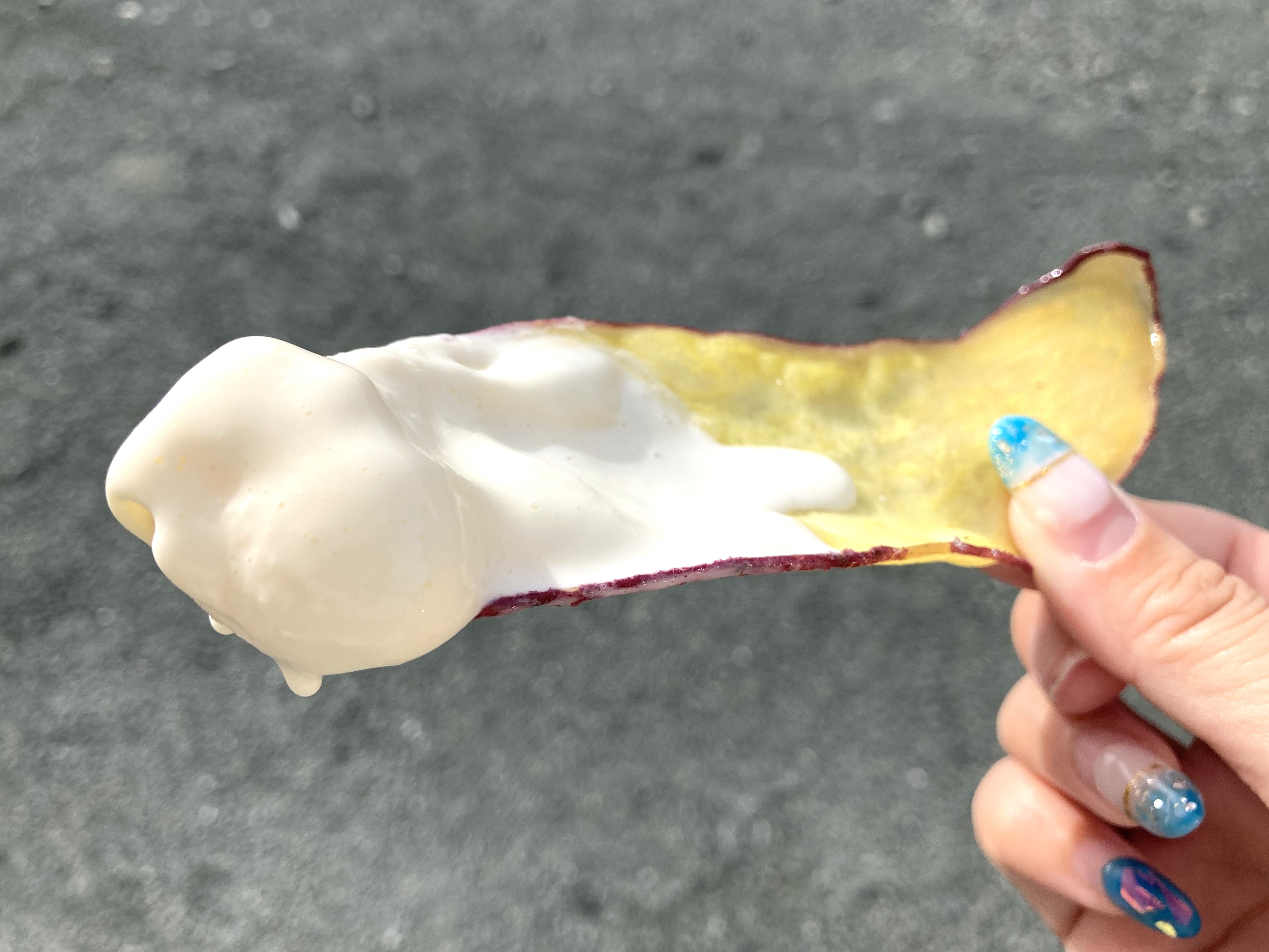 特大サイズのさつまいもチップスも2枚付いているので、さつまいもチップスにソフトクリームを乗せて…美味しくないわけがない。
