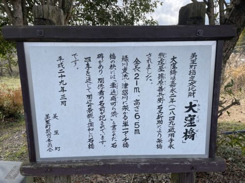 この大窪橋は洪水の時に橋が壊れないように橋の外側に水が流れるような構造で作られているそうです。どんな感じ?昔の人の知恵も労力もすごい。