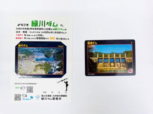 手元には、事務所からもらったダムカードが二枚。大切に保管してあります。流行っているそうで、県外からもダムカードを貰いに来る方々が沢山居られるそうですよ!(私は知りませんでした)