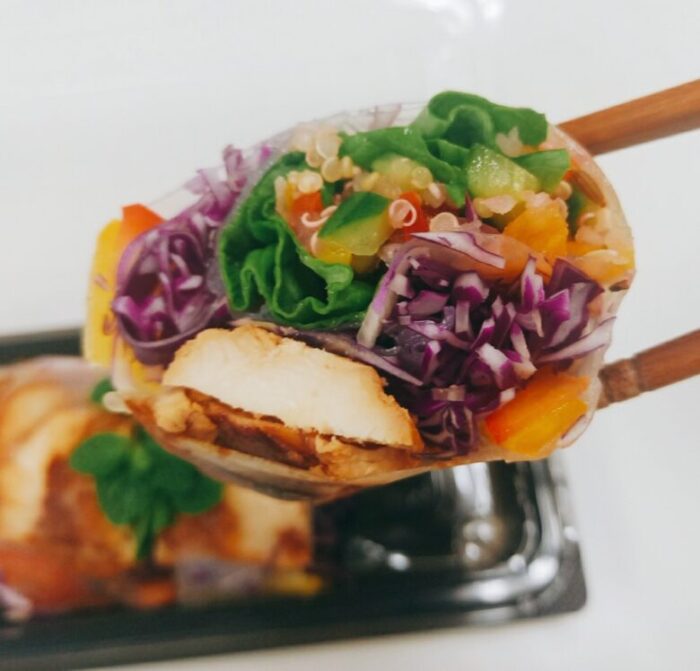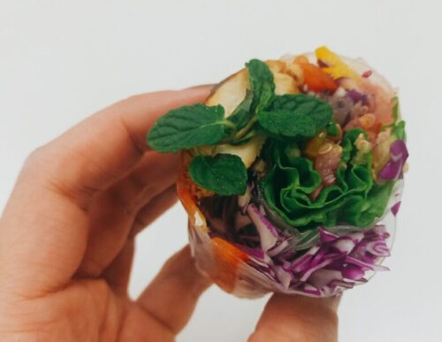 生春巻は野菜がたっぷりでモッチモチ。ミントと一緒に食べるとさらに美味!